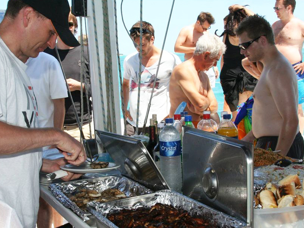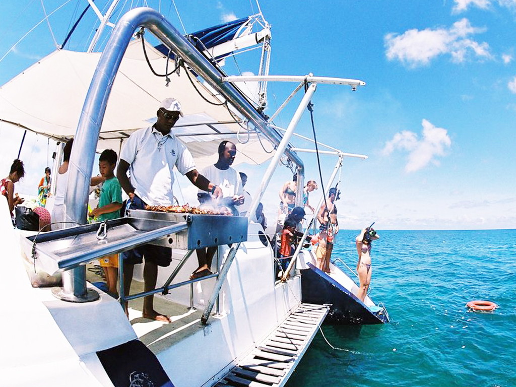Eventually, the catamaran will head to the beautiful Island of Benitiers. Before arriving at the Island, you will visit the famous Crystal Rock and will have a spectacular view of the Rempart Mountain, the Black River mountain range, and the magnificent Le Morne Mountain. For lunch, you will have a delicious BBQ buffet on the catamaran. The menu includes fresh fish, chicken, rice, pasta and potato salad, a variety of salads and a dessert.