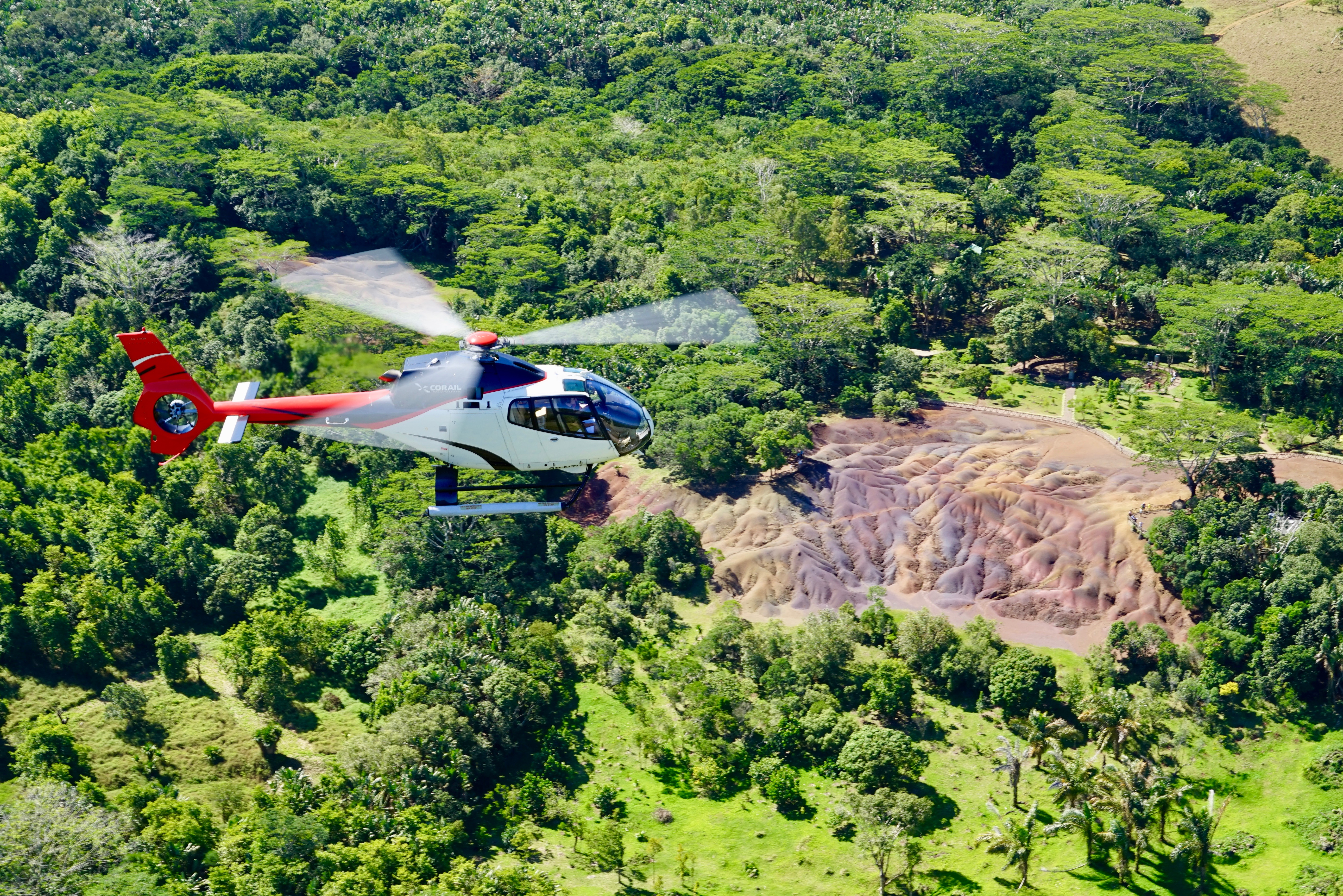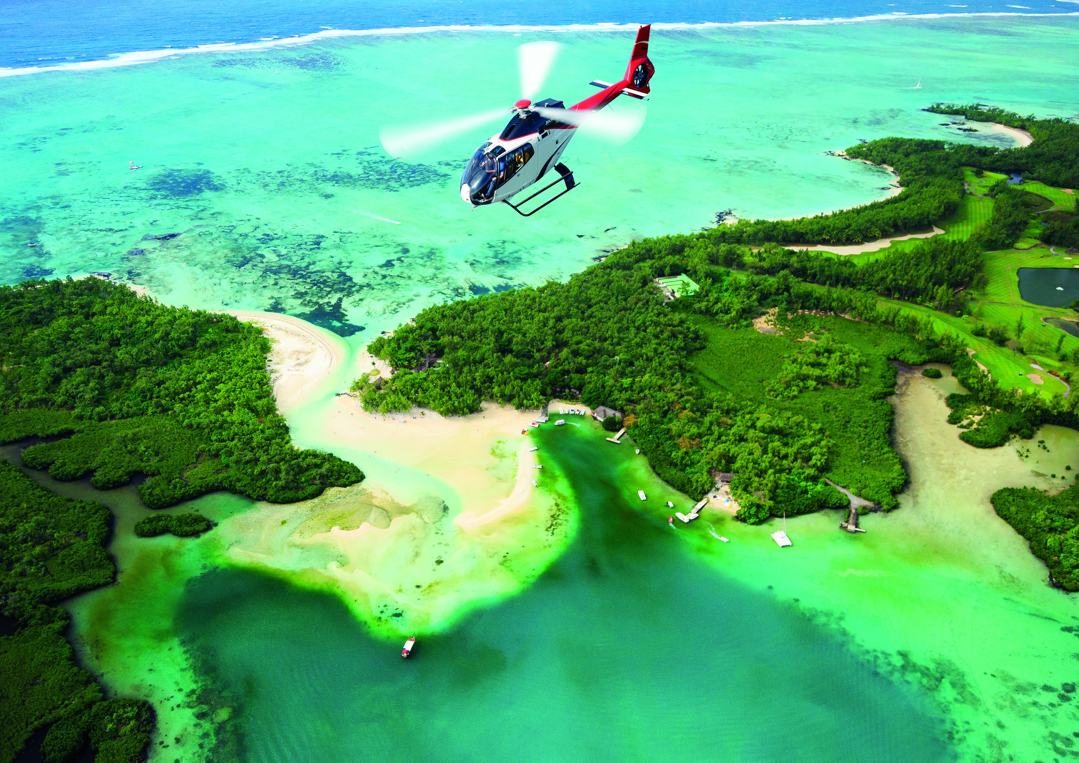 You first fly over Grand-Baie, renowned as a tourist destination and the largest bay on the island. The boats look like toys when admired from the air. After a short flight over the lush green landscapes and quiet village life, take in the lagoon at Trou-aux-Biches.